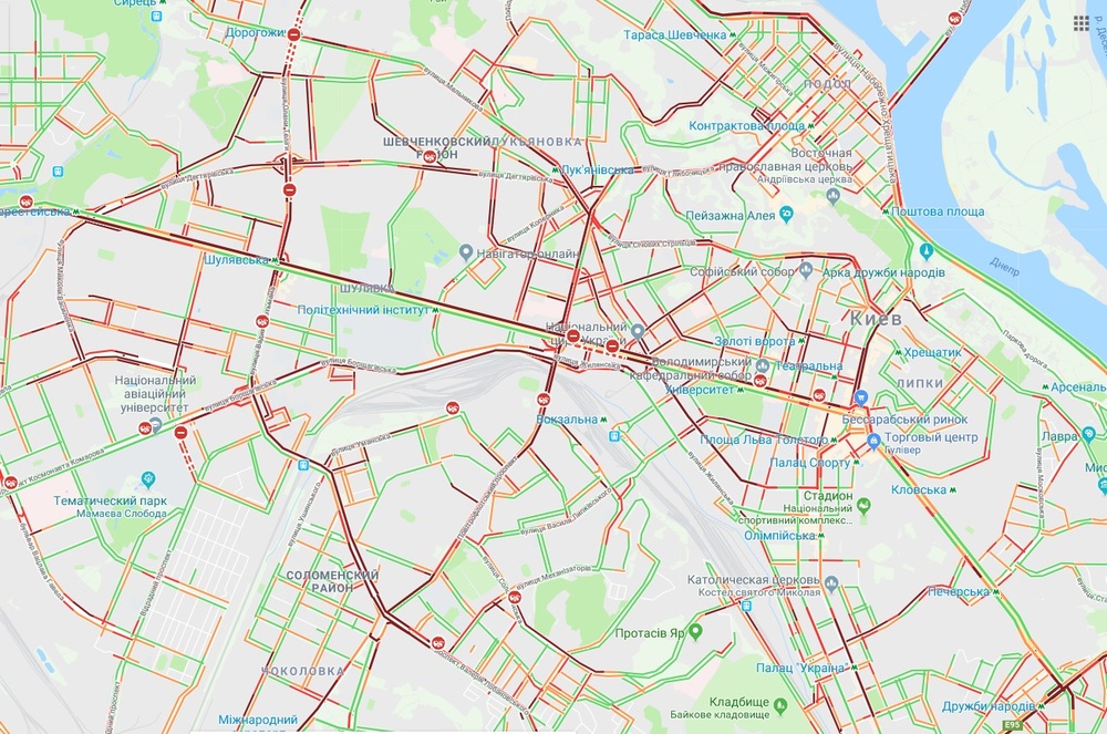 Самые большие пробки наблюдаются в центре Киева, в частности на бульваре Тараса Шевченко, на улице Хрещатик, Большая Васильковская, Басейная, Льва Толстого, Саксаганского, а также на Майдане Независимости, свидетельствуют данные Google Maps.