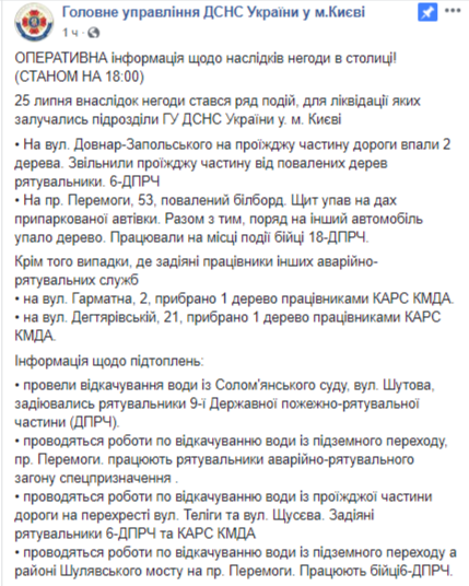 "Ул.Шутова, 1 затоплены помещения Соломенского суда (заявка поступила в 16:14). Работы по откачке воды продолжаются… ул.Довнар-Запольского - 2 дерева упали на проезжую часть дороги (16:23)… Работы на месте завершены, спасатели освободили проезжую часть от поваленных деревьев. пр.Победы,53 (16:35) - билборд упал на автомобиль. На месте работают спасатели…", - говорится в сводке, опубликованной на странице столичного главка ГСЧС в соцсети Facebook.