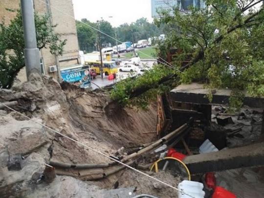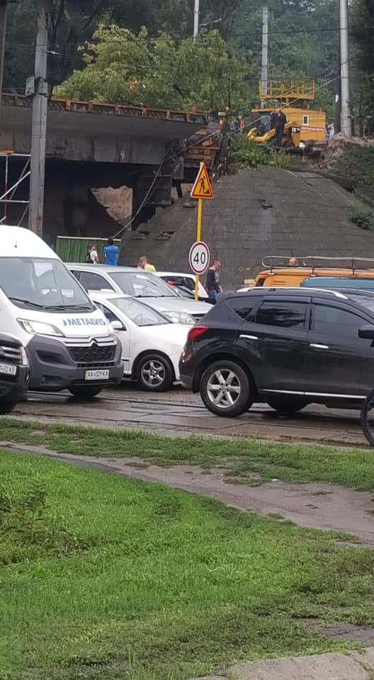 В Киеве после дождя над улицей Кирилловской по улице Елены Телиги обвалилась часть Кирилловского путепровода, где еще с весны продолжаются ремонтные работы.