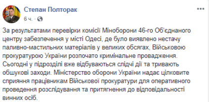"По результатам проверки комиссии Минобороны 46-го Объединенного центра обеспечения в городе Одессе, где была обнаружена недостача ГСМ в больших объемах, Военной прокуратурой Украины начато уголовное производство, - написал он в Facebook. - Сегодня в подразделении уже происходят следственные действия и продолжаются обыски".