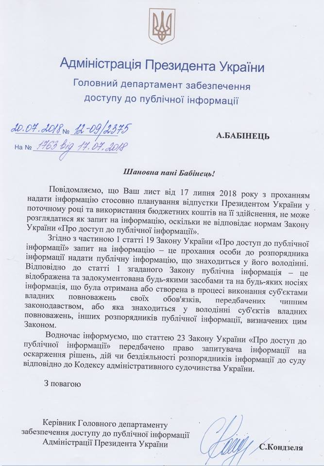 Также она отметила, что в своем запросе для АП она подчеркнула: если Петр Порошенко является лицом, деятельность которого финансируется из госбюджета, соответственно и его отпуск, то украинцы имеют право узнать, на что ушли бюджетные деньги. Но в АП заявили, что это не публичная информация.