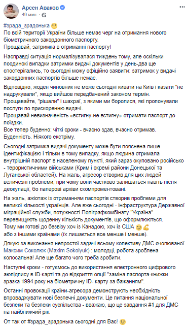 "По всей территории Украины больше нет очередей на получение нового биометрического загранпаспорта. Прощай, задержка в получении паспорта! На самом деле ситуация нормализовалась неделю назад, но поскольку единичные случаи задержки выдачи документов в день-два еще наблюдались, то сегодня могу официально заявить: задержек в выдаче загранпаспортов больше нет", - уверяет Аваков.