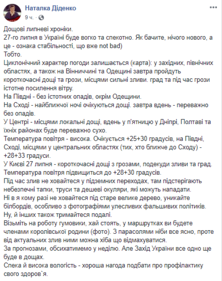 "Циклонический характер погоды остается (карта): в западных, северных областях, а также в Винницкой и Одесской завтра пройдут кратковременные дожди и грозы, местами сильные ливни, град и во время грозы существенное усиление ветра. На юге - без осадков, кроме Одесской области. На Востоке - ближайшей ночью ожидаются дожди. Завтра днем - преимущественно без осадков. В Центре - местами локальные дожди, днем в пятницу в Днепре, Полтаве и их районах будет преимущественно сухо. Температура воздуха - высокая. Ожидается + 25 ..+ 30 градусов, на юге, на востоке, местами в центральных областях (тех, кто ближе к Востоку) - + 28... + 33 градуса," - написала она.