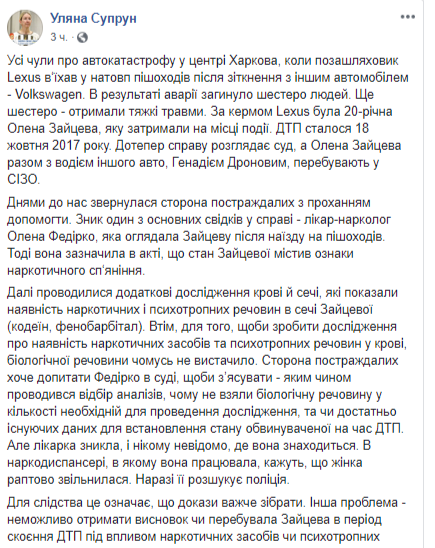 Исполняющая обязанности министра здравоохранения Ульяна Супрун поручила профильному учреждению подготовить заключение по случаю исчезновения врача-нарколога Елены Федирко, осматривавшей Елену Зайцеву после наезда на пешеходов. Об этом она сообщила на своей странице в Facebook.