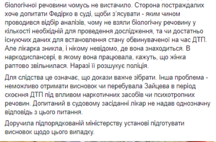 "Исчез один из основных свидетелей по делу - врач-нарколог Елена Федирко, которая осматривала Зайцеву после наезда на пешеходов. Тогда она отметила в акте, что состояние Зайцевой содержало признаки наркотического опьянения. Дальше проводились дополнительные исследования крови и мочи, которые показали наличие наркотических и психотропных веществ в моче Зайцевой (кодеин, фенобарбитал). Впрочем, для того, чтобы сделать исследование о наличии наркотических средств и психотропных веществ в крови, биологического вещества почему-то не хватило. Сторона пострадавших хочет допросить Федирко в суде, чтобы выяснить - каким образом проводился отбор анализов, почему не взяли биологическое вещество в количестве, необходимом для проведения исследования, и достаточно ли существующих данных для установления состояния обвиняемой на время ДТП. Но врач исчез, и никому неизвестно, где она находится. В наркодиспансере, в котором она работала, говорят, что женщина внезапно уволилась. Теперь ее разыскивает полиция", - отметила Супрун.
