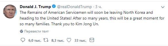 "Останки американских военнослужащих скоро покинут Северную Корею и отправятся в Соединенные Штаты! После стольких лет это будет великий момент для стольких семей. Спасибо Ким Чен Ыну", – написал американский лидер перед вылетом самолета.