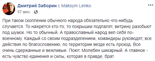 "При таком скоплении обычного народа обязательно что-нибудь случается. То нажрется кто-то, то покрышки подпалят, витрину разобьют под шумок. Но то обычный. А православный народ вел себя по-военному. Каждый со своим подразделением, командиры руководят, все действия по благословению, по территории везде есть проход. Все очень сдержанные и вежливые. Поют. Молебен шикарный. А главное - есть чувство единения и силы, которая в правде, брат", - написал он.