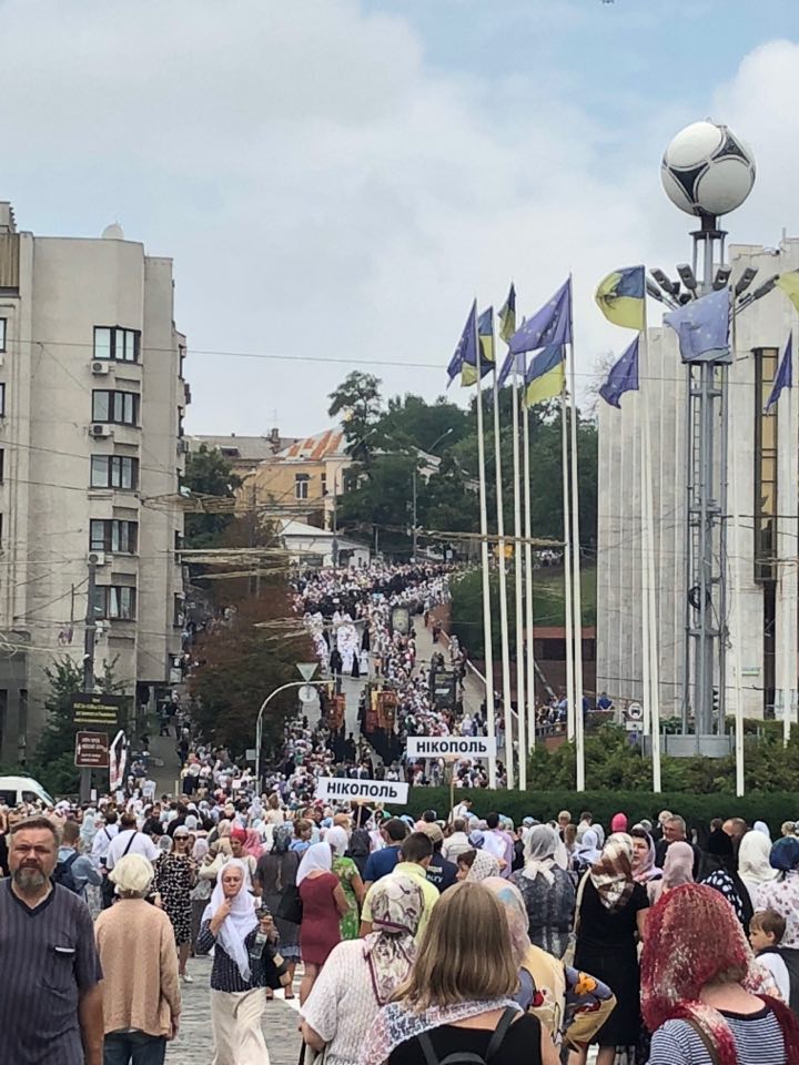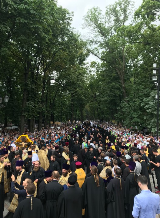 15:00  Крестный ход, несмотря на то, что имеет не слишком длинный маршрут, все еще движется по Киеву. Людей очень много.
