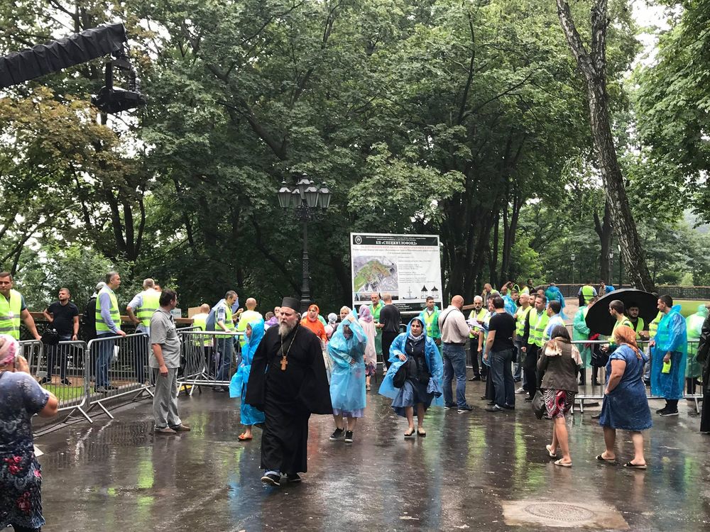 10:12  На Владимирской горке уже собираются паломники. Но дождь собрался раньше. Люди терпеливо мокнут в ожидании праздника.