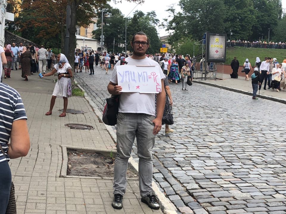 12:21  По пути следования верующих стоит вот такой человек. Он пытается убедить тысячи украинцев в том, что их церковь - на самом деле агент Кремля.