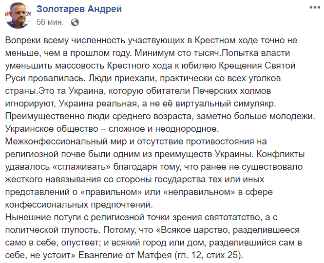 16:14  Политолог Андрей Золотарев считает, что на крестный ход сегодня вышла "та Украина, которую обитатели Печерских холмов игнорируют".