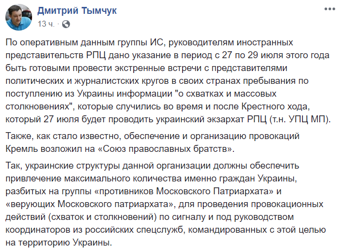 По его версии, участники столкновений - как сторонники, так и противники УПЦ - работают "под руководством координаторов из российских спецслужб, командированных с этой целью на территорию Украины".