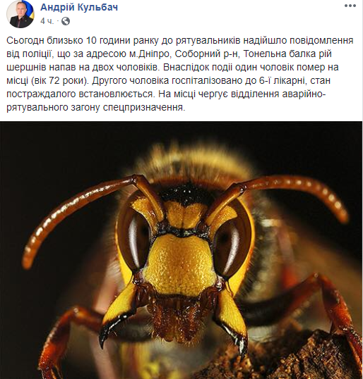 Сегодня, 28 июля, в Днепре в результате нападения роя шершней погиб 72-летний мужчина, еще один был госпитализирован. Об этом сообщил начальник Главного управления ГосЧС в Днепропетровской области Андрей Кульбач на своей странице в Facebook.