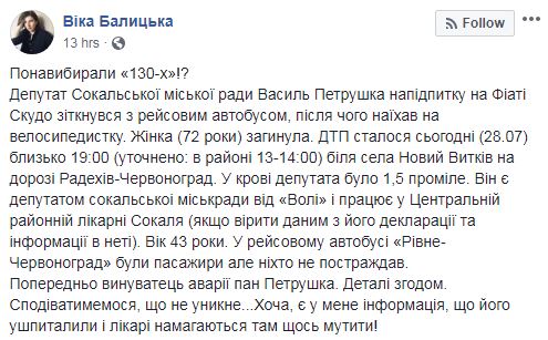По словам Балицкой, в крови депутата было 1,5 промилле алкоголя. Он является депутатом сокальського горсовета от "Воли" и работает в Центральной районной больнице Сокаля. Возраст 43 года.
