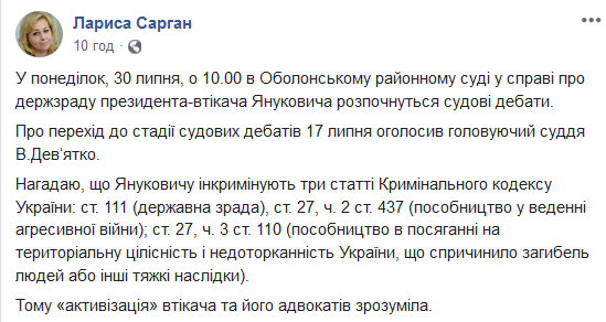 В понедельник, 30 июля, в 10.00 в Оболонском районном суде Киева начнутся судебные дебаты по делу о государственной измене беглого экс-президента Украины Виктора Януковича.