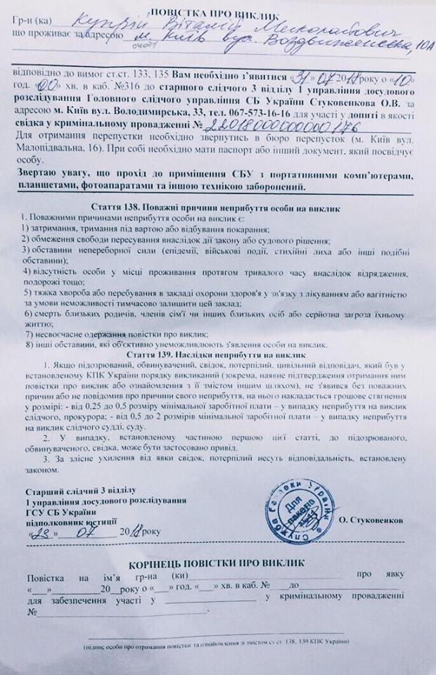 "Сегодня получил повестку о вызове на допрос в качестве свидетеля в уголовном производстве по проведению президентом Петром Порошенко пиар-акции по дарению оружия подразделениям Вооруженных Сил Украины.