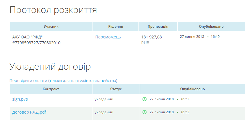 Из информации следует, что административно-хозяйственное управление ОАО "Российские железные дороги" выиграло тендер филиала "Центр обеспечения производства" ПАО "Украинская железная дорога" на поставку 96 наградных знаков "Почетный железнодорожник" на общую сумму 182 тысяч рублей (чуть больше 77 тысяч гривен).