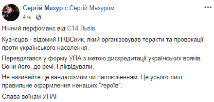 "Кузнецов - известный НКВДшник, который организовывал теракты и провокации против украинского населения. Переодевался в форму УПА с целью дискредитации украинских воинов. Они его, кстати, и ликвидировали. Не называйте это вандализмом или осквернением. Это всего лишь правильное оформление ненаших "героев", - написал Мазур на своей странице в соцсети Facebook.