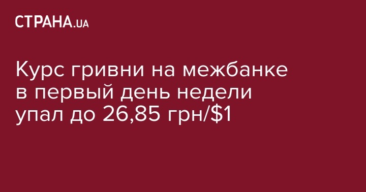 Курс гривни на межбанковском валютном рынке в понедельник, 30 июля, снизился до 26,85 грн/$1 с 26,725 грн/$1 в предыдущий рабочий день, сообщили агентству "Интерфакс-Украина" дилеры коммерческих банков.