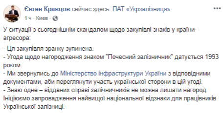 Комментируя обращение "Укрзализныци" к Мининфраструктуры касательно пересмотра участия украинской стороны в соглашении от 1993 года о награждении знаком "Почетный железнодорожник", и.о. руководителя ПАО написал: "Знаю одно - преданных делу железнодорожников нельзя оставлять без наград".