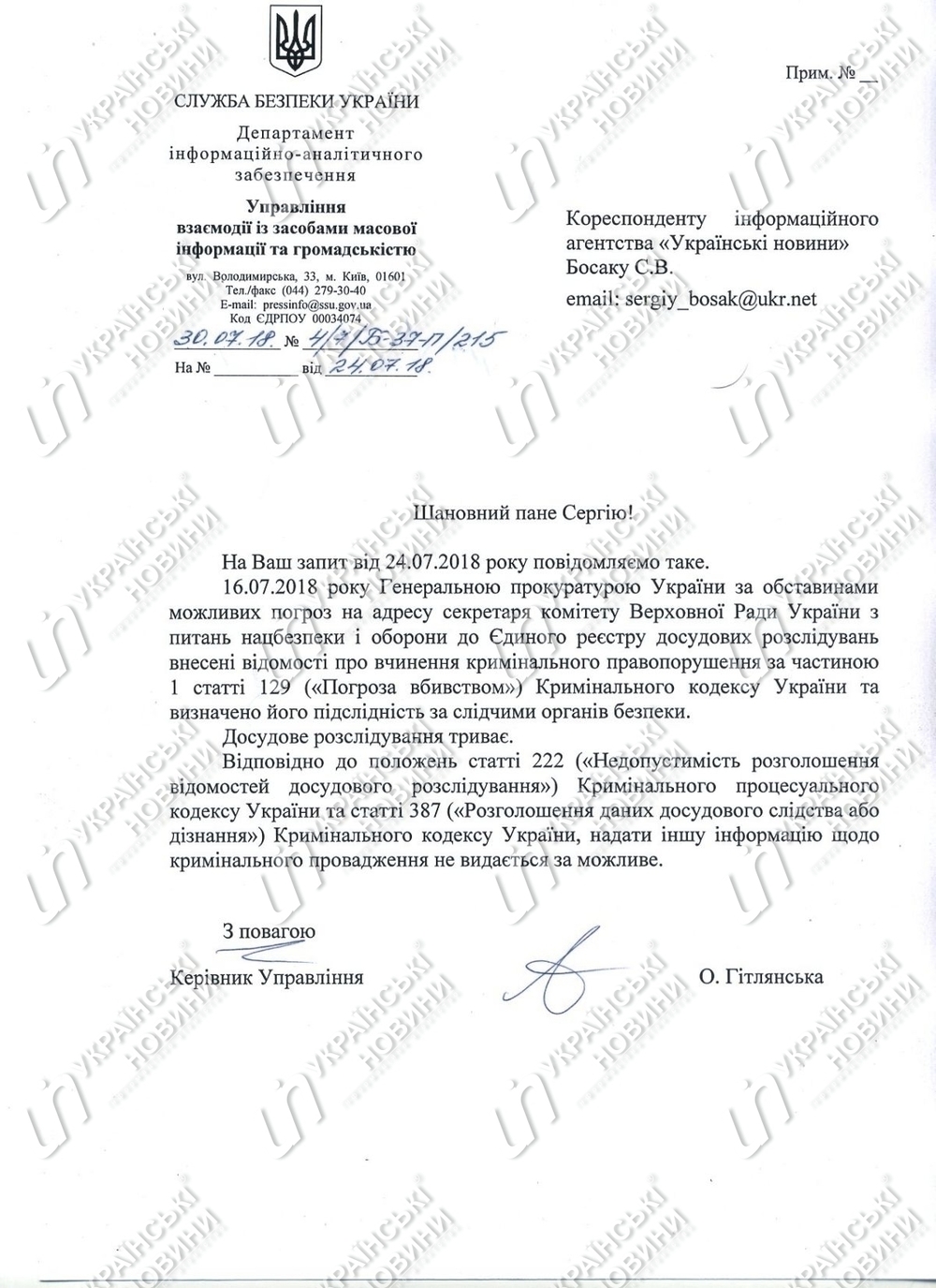 В частности, СБУ отказалась сообщить информацию о том, допрашивался ли по делу Пашинский и Блыстив, а также о том, на каком этапе находится расследование дела.