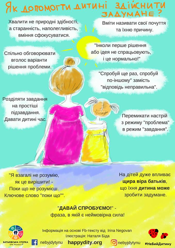"Путь к цели начинается с детства. А именно с умения быть усердным, настойчивым, сфокусированным на задачах и ни за что НЕ сдаваться. Большую роль в том, чтоб ребенок научился этим навыкам, играют родители. Прежде всего - своей искренней верой в то, что ребенку все удастся. На детей влияет настроение родителей - если ребенок чувствует, что мама с папой верят в нее, то она также будет иметь больше сил и энергии осуществить задуманное", - говорит Супрун.