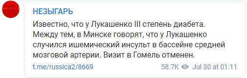 Между тем, популярный политический Telegram-канал "Незыгарь" также сообщал о том, что Лукашенко страдает от сахарного диабета и в целом испытывает большие проблемы со здоровьем. В частности с давлением и ногами. В последнее время белорусский лидер, как сообщали авторы "Незыгаря", "много спит, безмерно ест и работает 4-5 часов в день".