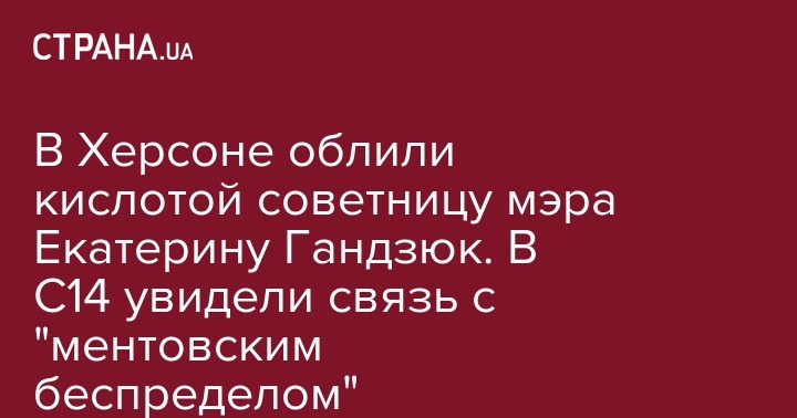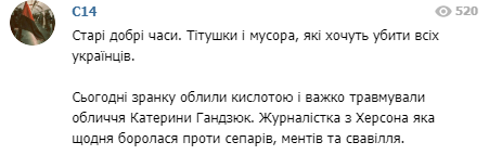 "Сегодня утром облили кислотой и тяжело травмировали лицо Екатерины Гандзюк. Журналистка из Херсона которая ежедневно боролась против сепаров, ментов и беспредела", - говорится в сообщении.