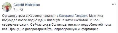 "Сегодня утром в Херсоне напали на Катерину Гандзюк. Мужчина поджидал возле подъезда, и плеснул на Катю кислотой. У нее серьезные ожоги. Сейчас она в больнице, никаких подробностей пока нет", - написал Никитенко.