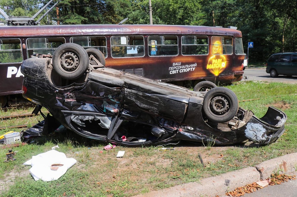 В Киеве легковушка врезалась в трамвай и перевернулась на крышу. Больше всего пострадал ребенок