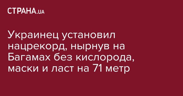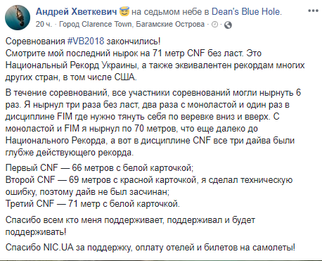Украинский фридайвер, инструктор и бизнесмен Андрей Хветкевич установил национальный рекорд Украины, погрузившись на 71 метр в Атлантический океан на Багамах не только без кислородного баллона, но и без маски и ласт. Об этом Андрей Хветкевич написал на своей странице в Facebook.