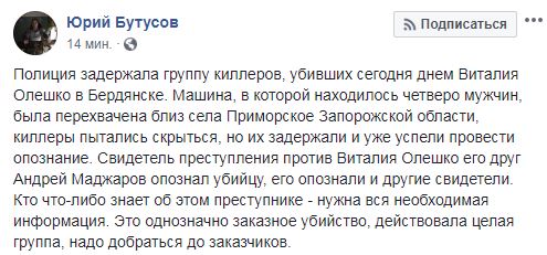 "Машина, в которой находилось четверо мужчин, была перехвачена близ села Приморское Запорожской области, киллеры пытались скрыться, но их задержали и уже успели провести опознание", - написал он.