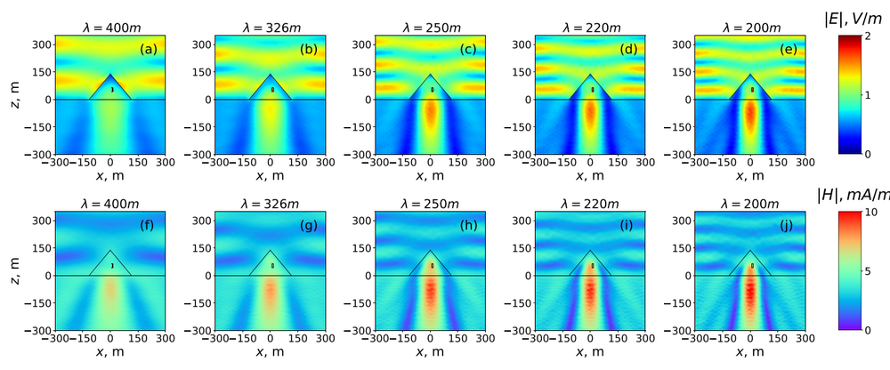 Численные расчеты, основанные на уравнениях Максвелла, показали, что оба сечения достигают максимума при длине волны около 230 и 330 метров вне зависимости от направления падающей волны. Это указывает на электромагнитные резонансы внутри пирамиды. Более того, оказывается, что на резонансной длине волны напряженность электрического поля внутри полости резко вырастает, то есть полости концентрируют электрическую энергию. Аналогичные эффекты для магнитного поля не наблюдались во всем диапазоне длин волн.