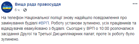 "В Нацполицию поступило сообщение, что здание заминировали. Работа приостановлена, всех работников и участников заседаний эвакуировали. Это случилось вскоре после начала заседания Второй и Третьей дисциплинарных палат", - сообщили "Стране" в секретариате ВСП.