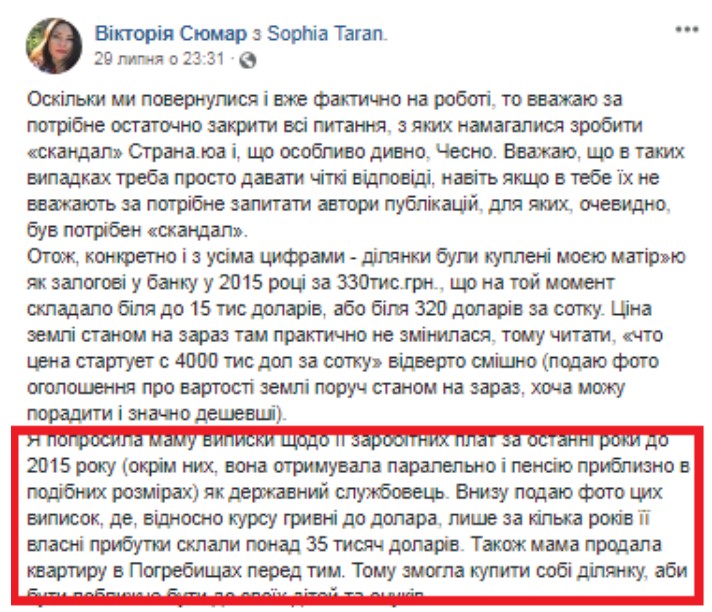 Кроме того, Сюмар в своем интервью подчеркивает, что ей есть из чего помогать матери, потому что в прошлом году она получила от мужа миллион гривен за то, что они продали дачу: "Я в прошлом году получила компенсацию от бывшего мужа (около миллиона гривен) и в настоящее время помогала матери со строительством. Все это будет указано в моей следующей декларации за этот год, потому что дом только сейчас сдается в эксплуатацию".