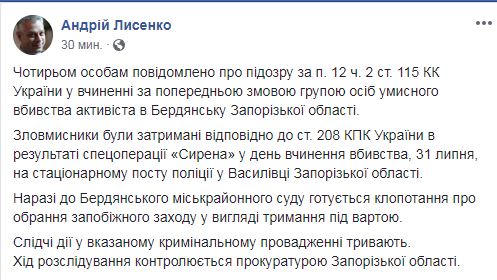 "Четырем лицам сообщено о подозрении по п. 12 ч. 2 ст. 115 УК Украины (наказание - вплоть до пожизненного - Прим. Ред.) в совершении по предварительному сговору группой лиц умышленного убийства активиста в Бердянске Запорожской области", - говорится в сообщении.