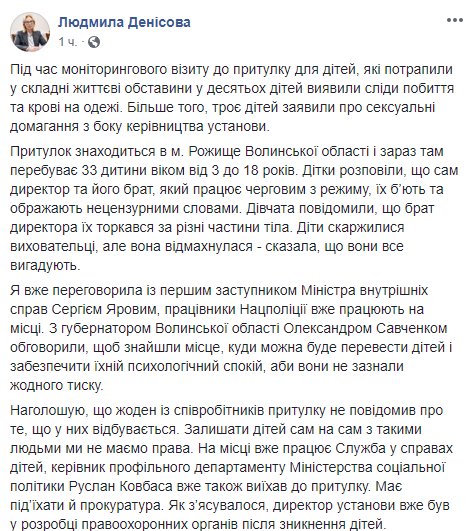 Во время мониторингового визита у десяти детей приюта в городе Рожище Волынской области обнаружили следы побоев и крови на одежде. Об этом в четверг, 2 августа, заявила омбудсмен Людмила Денисова на своей странице в Facebook.