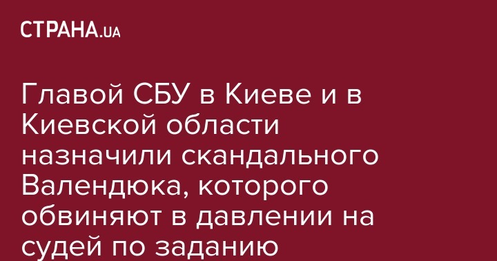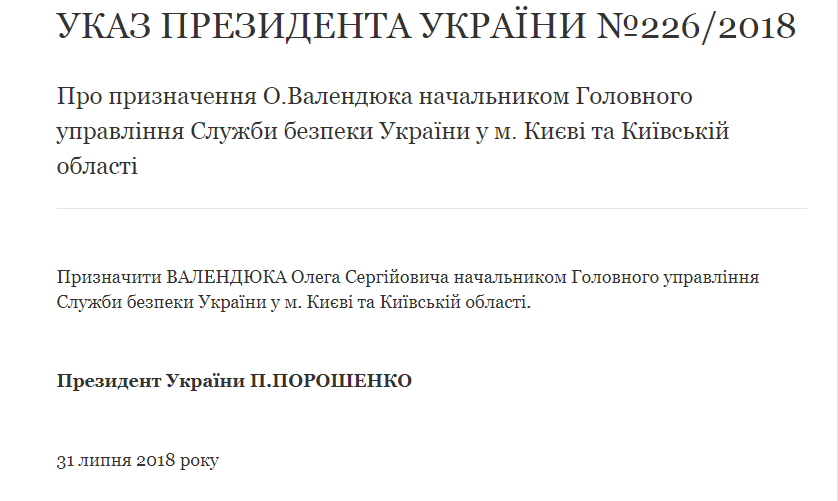 Еще одним указом президент назначил начальником СБУ в Киеве и Киевской области Олега Валендюка, который ранее занимал должность заместителя главы Службы внешней разведки.