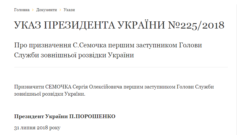 Президент Украины Петр Порошенко уволил Сергея Семочко с должности начальника Главного управления Службы безопасности Украины (СБУ) в Киеве и Киевской области и назначил его первым заместителем главы Службы внешней разведки (СВР).