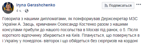 "Как сообщил Госсекретарь МИД Украины Заяц, крымчанин Александр Костенко вместе с нашими консулами прибыли в наше посольство в Москве под утро. После короткого отдыха собираются в Киев," - написала Ирина Геращенко.