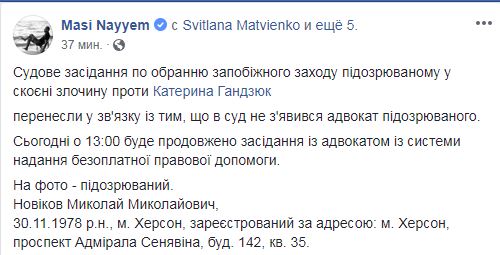 "Судебное заседание по избранию меры пресечения подозреваемому в совершении преступления против Екатерины Гандзюк перенесли в связи с тем, что в суд не явился адвокат подозреваемого", - говорится в сообщении.