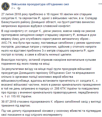 "27 июля 2018 примерно в 18 часов 10 минут между старшим солдатом К. и сержантом Г., одной из воинских частей, в г.. Соледар Бахмутского района Донецкой области, на почве внезапно возникших неприязненных отношений произошел словесный конфликт.