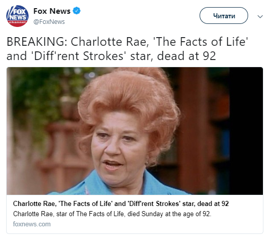 В США скончалась известная голливудская актриса Шарлотта Рэй. Звезда умерла в возрасте 92 лет, в Лос-Анджелесе в собственном доме в воскресенье, 5 августа 2018 года.