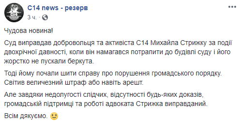 "Благодаря безалаберности следователей, отсутствии каких-либо доказательств, общественной поддержке и работе адвоката Стрижка оправдан", - сообщили 6 августа в С14.