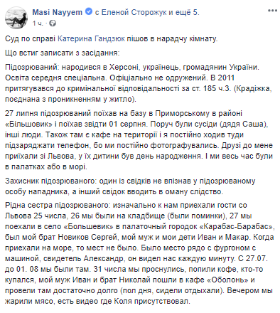Сестра подозреваемого Ирина Кодакова также рассказала, что с 27 июля по 1 августа ее семьи, включая брата Николая Новикова, не было в Херсоне: они отдыхали в Большевике, в палаточном городке "Карабас-Барабас" - и вернулись домой в ночь на 2 августа.