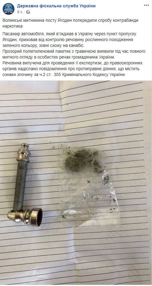 Украинские таможенники нашли прозрачный полиэтиленовый пакетик с травой во время полного таможенного осмотра в личных вещей украинца о чем сразу сообщили в социальной сети.