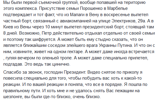 Мы были первой съемочной группой, вообще попавшей на територию этого комплекса. Присутствие семьи Порошенко в Марбелье подтверждает и тот факт, что из Малаги в Вену в воскресенье вылетел частный борт, связанный с авиакомпанией на улице Электриков, 29а. А в Киев из Вены через 10 минут вылетел президентский борт, стоявщий там 8 дней. Возможно, Петр действительно отдыхал отдельно от своей семьи и поэтому так шифруется. А может быть ему стыдно сказать, что он является ближайшим соседом злейшего врага Украины Путина. И что он с ним, извините, живет на одном гектаре. А может даже иногда встречается , гуляя вечером по оленьей тропе. А может даже специально прилетел, подгадав. Это ведь так цинично.
