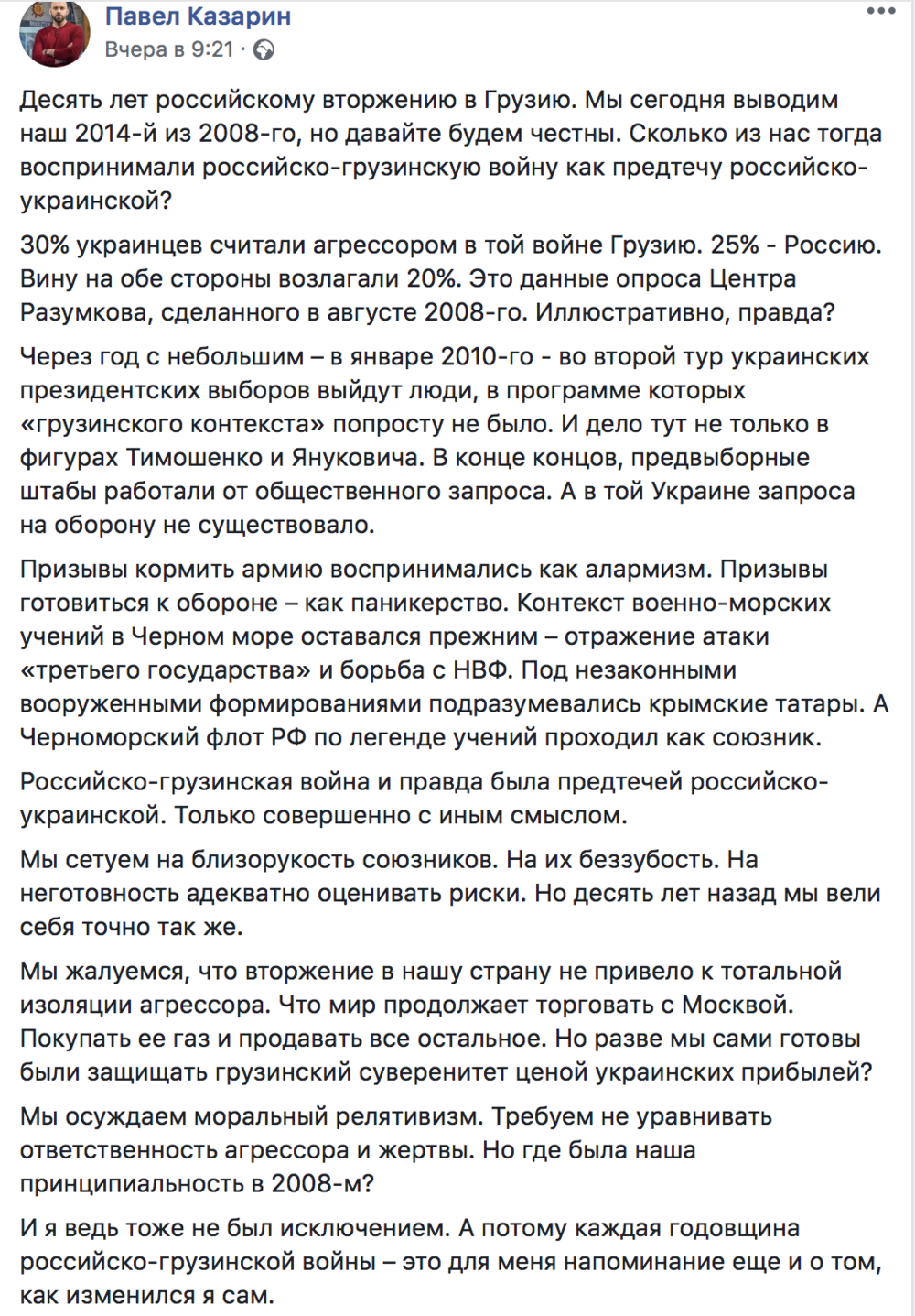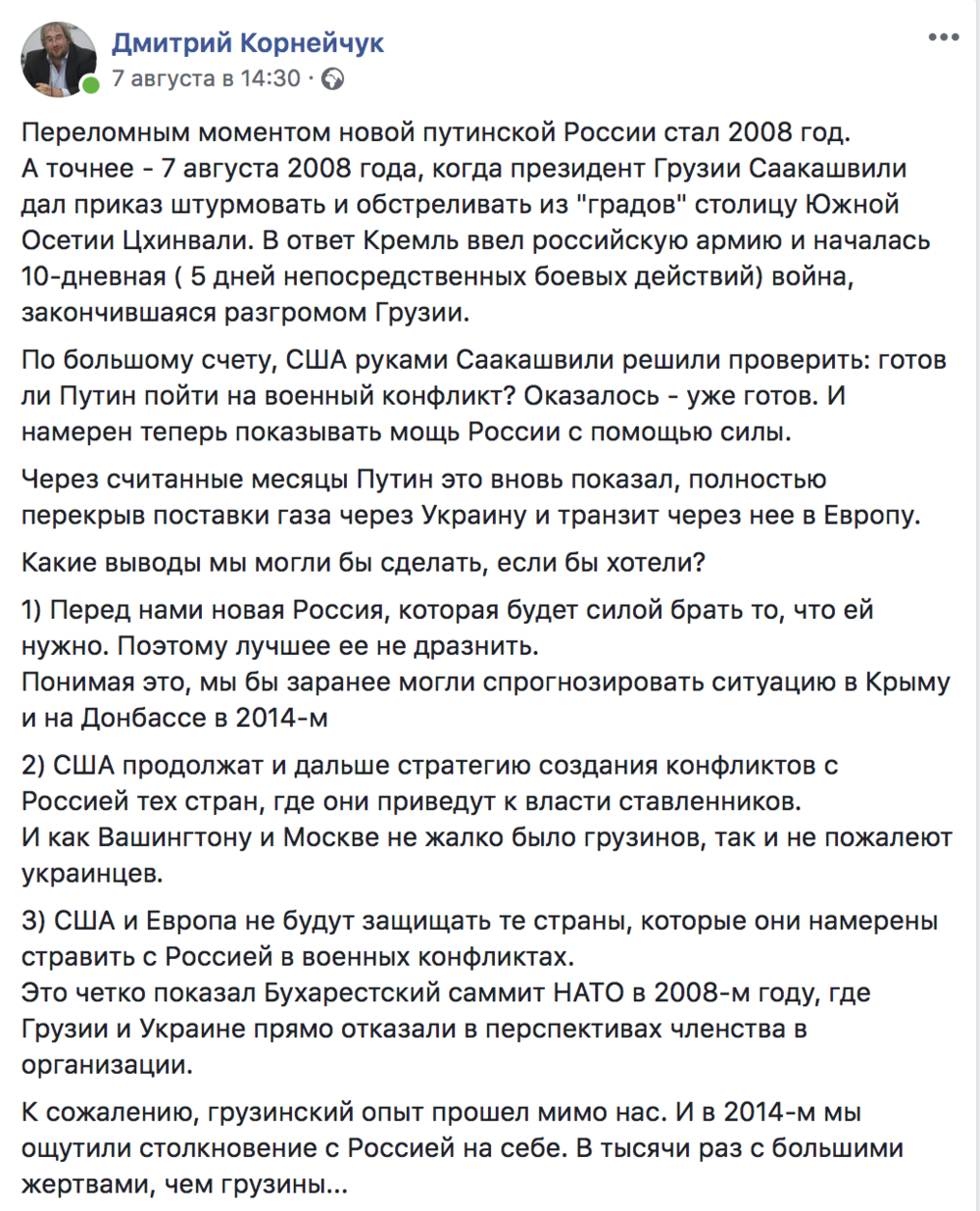 С другой стороны, оппозиционные блогеры и эксперты говорят, что урок событий 2008 года для Украины был совсем другим. А именно – то, что Запад может провоцировать постсоветские страны на противостояние с Россией. Последняя отвечает на это в том числе и военной силой, после чего Запад не приходит на помощь.