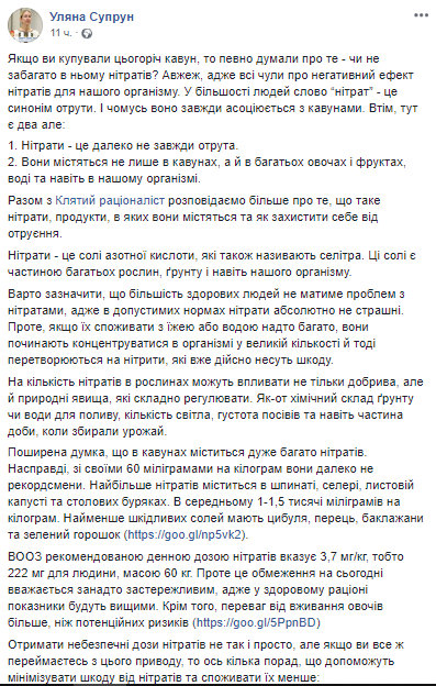 Нитраты содержатся не только во многих овощах и фруктах, но и в человеческом организме. При этом они не всегда действуют как яд. Такое мнение высказала на своей странице в Facebook и. о. министра здравоохранения Ульяна Супрун.
