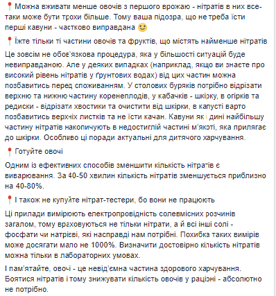 По словам Супрун, ВООЗ рекомендованной дневной дозой нитратов указывает 3,7 мг/кг, то есть 222 мг для человека массой 60 кг. Однако это ограничение на сегодня считается слишком предостерегающим, ведь в здоровом рационе показатели будут выше. Кроме того, преимуществ от употребления овощей больше, чем потенциальных рисков.